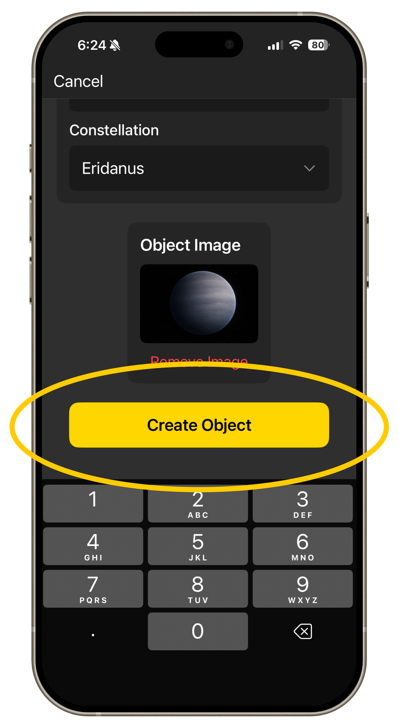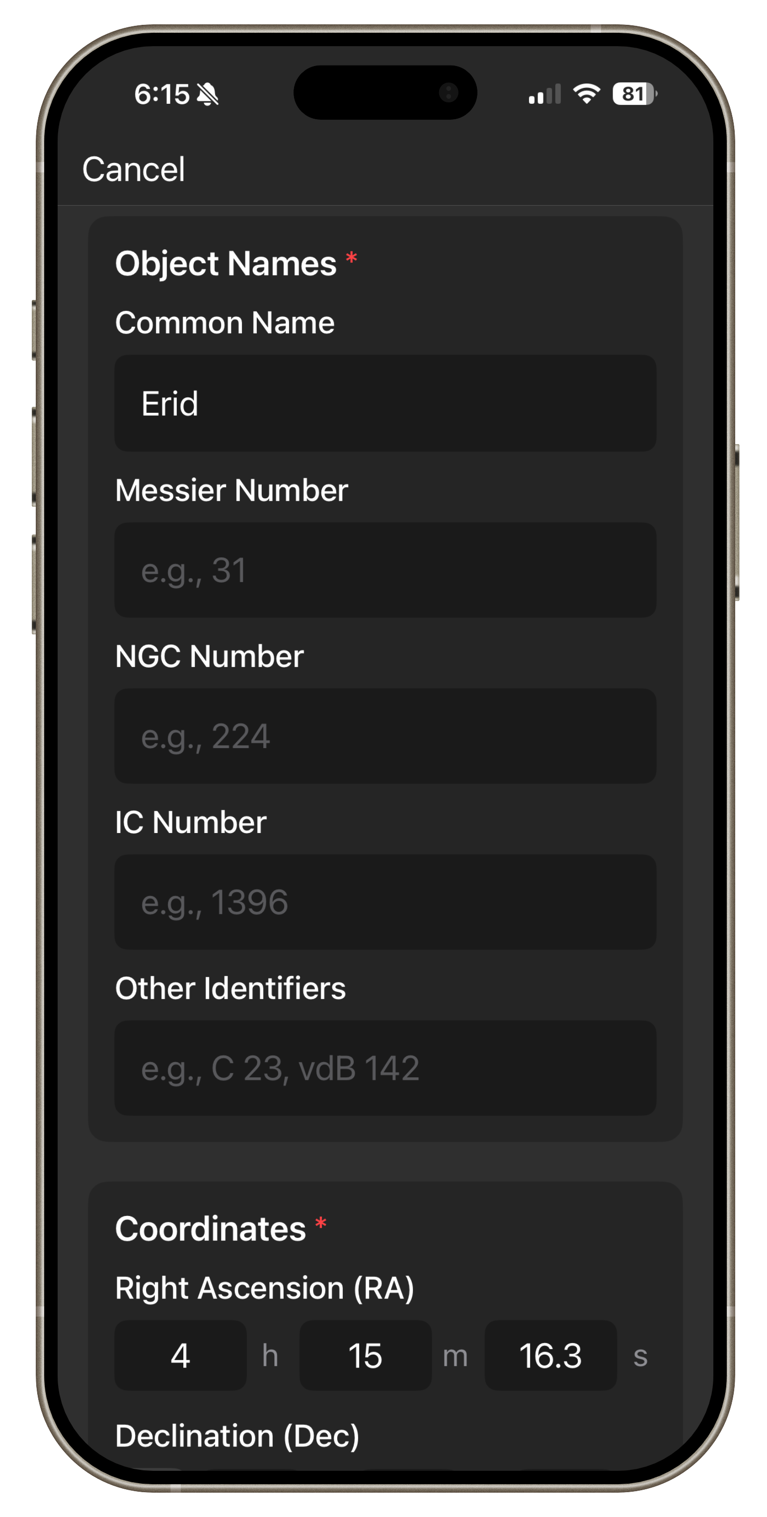 Add in details about the object. Note that you must include some type of name or catalog number, an RA/Dec pair, and object type. The other properties are optional.