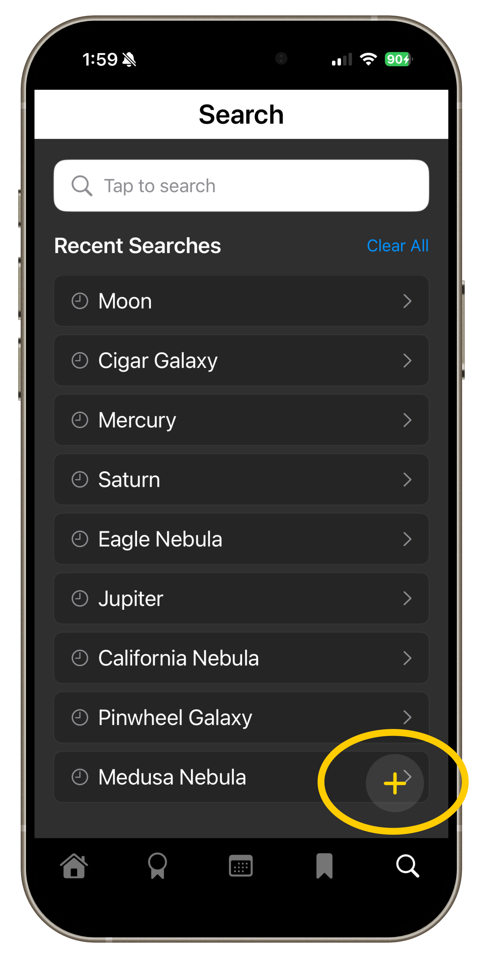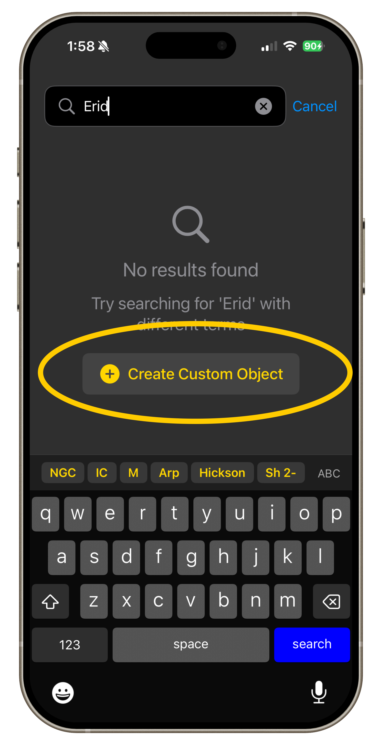 From the Search page, click either the yellow + button, or the Create Custom Object button on a search with no results.