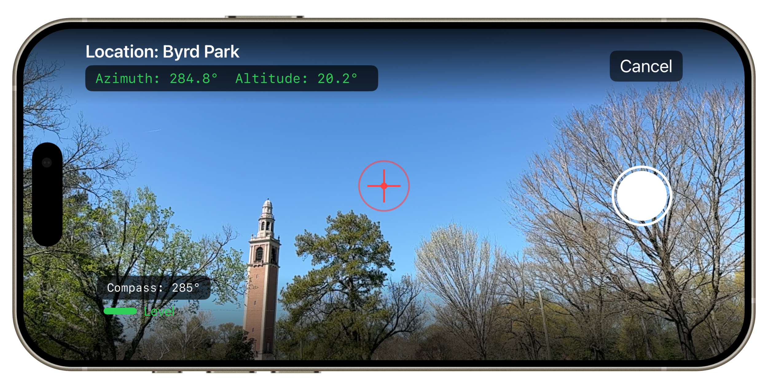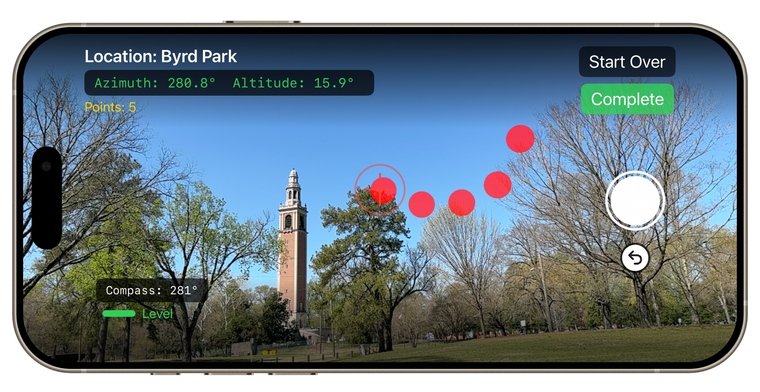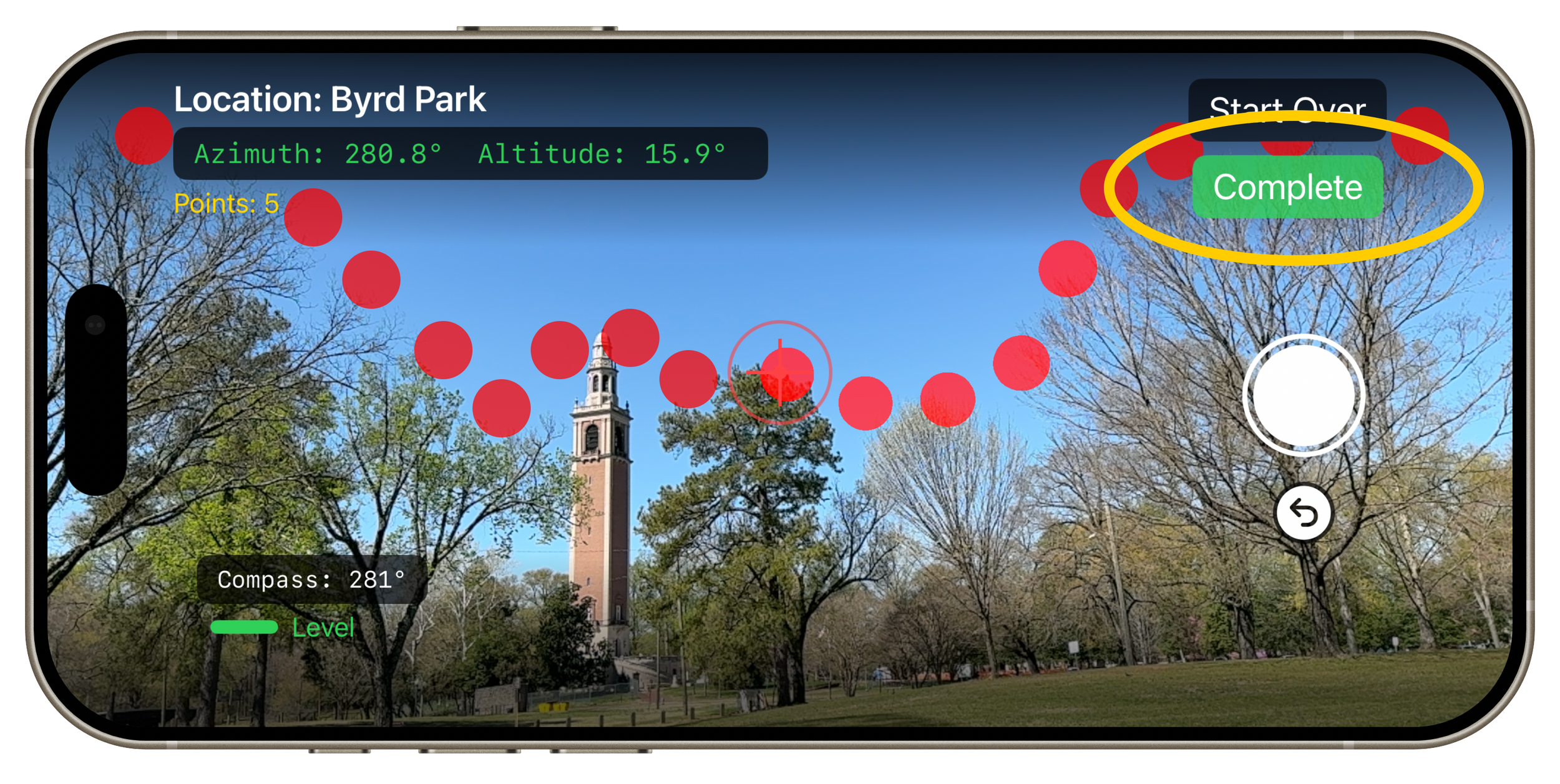 Use the camera view to place virtual points on the border of the open sky and obstructions. Go around 360 degrees for a complete horizon, or trace a window of visibility through the canopy.