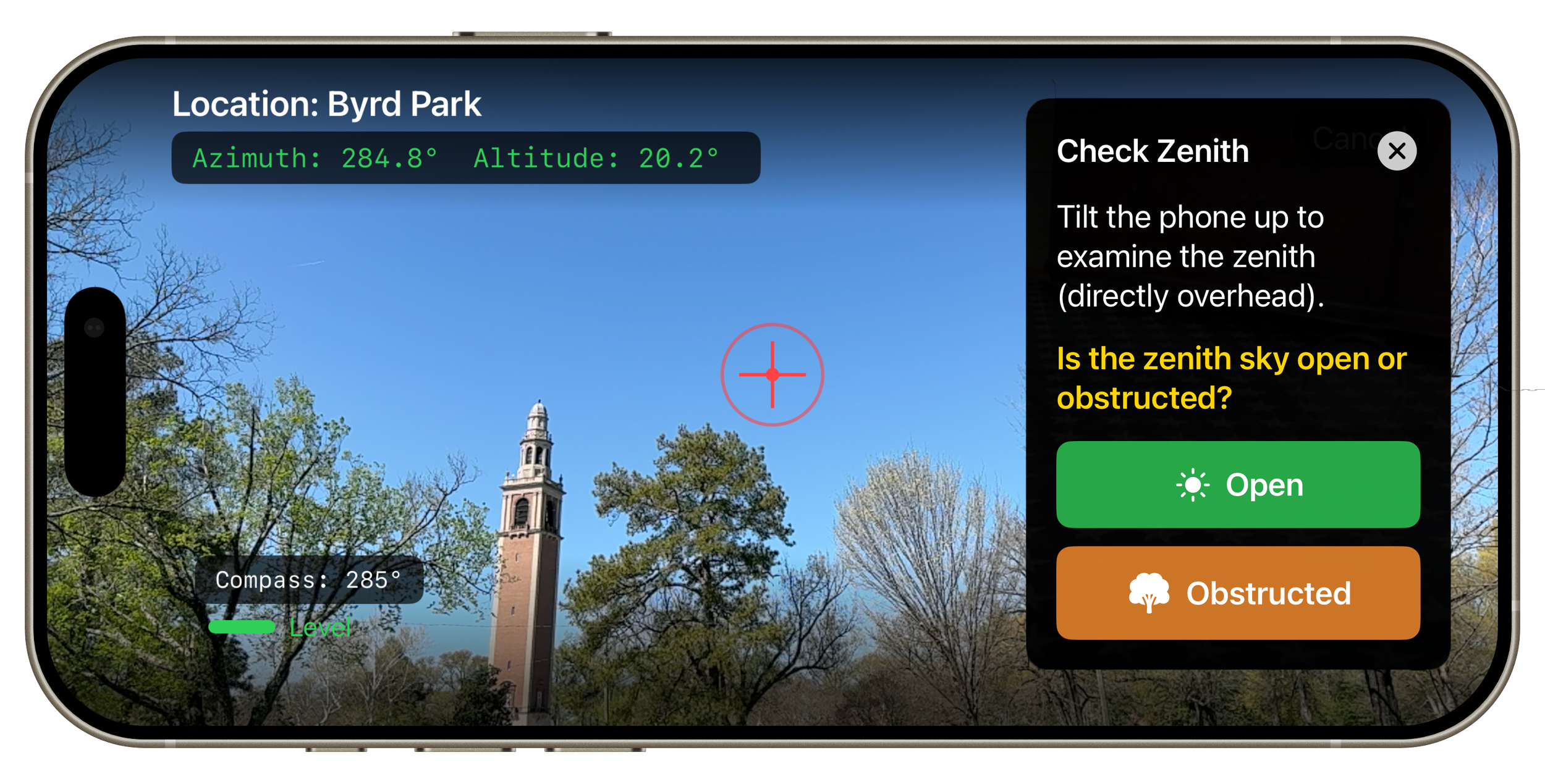 Indicate whether the zenith, directly above the telescope location, is open or obstructed. Just look up, or tilt the phone up for a virtual zenith.